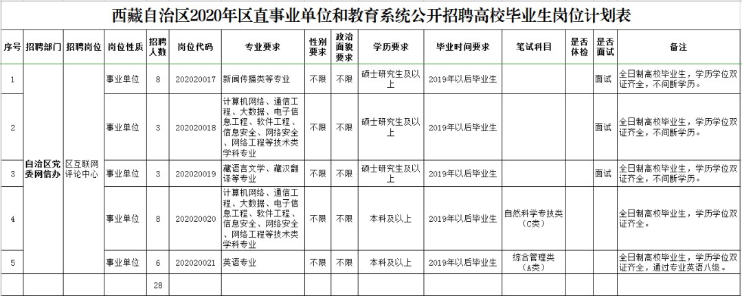 根据西藏自治区人力资源和社会保障厅发布《西藏自治区2020年区直事业单位和教育系统公开招聘高校毕业生公告》,2020年区直事业单位和教育系统采取定编定岗的方式,计划从高校毕业生中公开招聘4368名事业单位工作人员。其中,区党委网信办区互联网评论中心招聘28人,戳图了解详情吧~